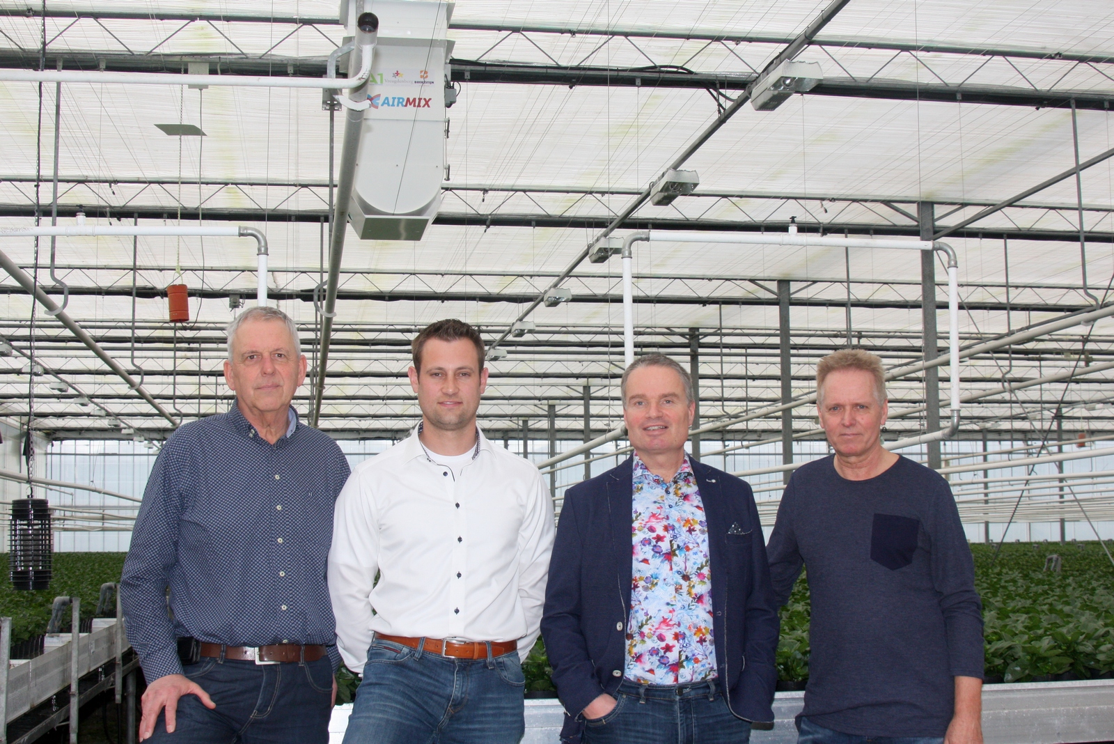 Om toch de principes van Het Nieuwe Telen toe te kunnen passen, koos Leo Valstar voor Airmix-ventilatoren waarmee hij koudere, droge lucht van boven het scherm kan mengen met de vochtigere warme kaslucht onder het scherm. “Ik had het in een artikel in Onder Glas zien staan. Het leek me wel een goede techniek om het vocht te beheersen in een bestaande kas. Ik ben in het voorjaar van 2016 met een proef gestart in één afdeling van 4.500 m2. We konden het scherm langer dicht houden. De RV was naar schatting 5 procent lager en het was er zelfs in de zomer iets koeler.”